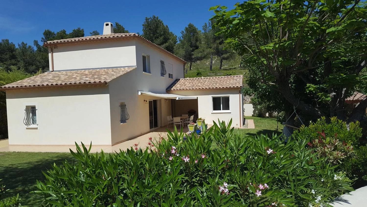 Villa aux prestations soignées sur 695M2 de terrain plat , arboré exposé plein sud , au calme . Villa sur deux niveaux , au rez-de-chaussée vous trouverez un spacieux salon avec un poêle , un séjour avec une cuisine ouverte aménagée et équipée, 2 chambres avec rangements et dressing , salle d'eau et deux wc . À l'étage , une pièce qui peut faire office de salon séjour, avec coin cuisine , une chambre , salle de bain avec baignoire et douche, wc indépendant . cette villa peut donc offrir deux appartements indépendants si on le souhaite . Garage de 20M2, panneaux solaires , puits avec forage , douche extérieure et abris de jardin.